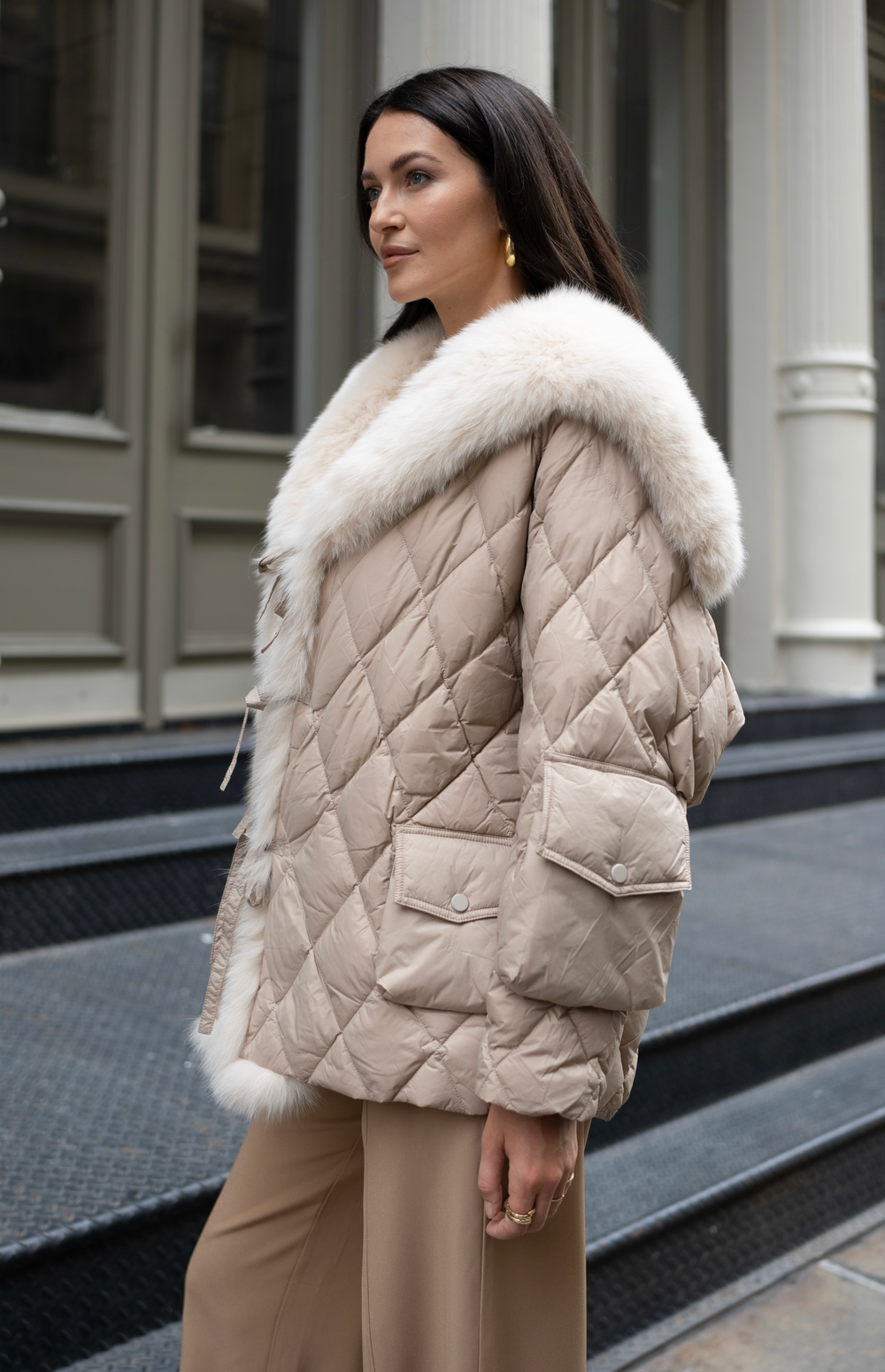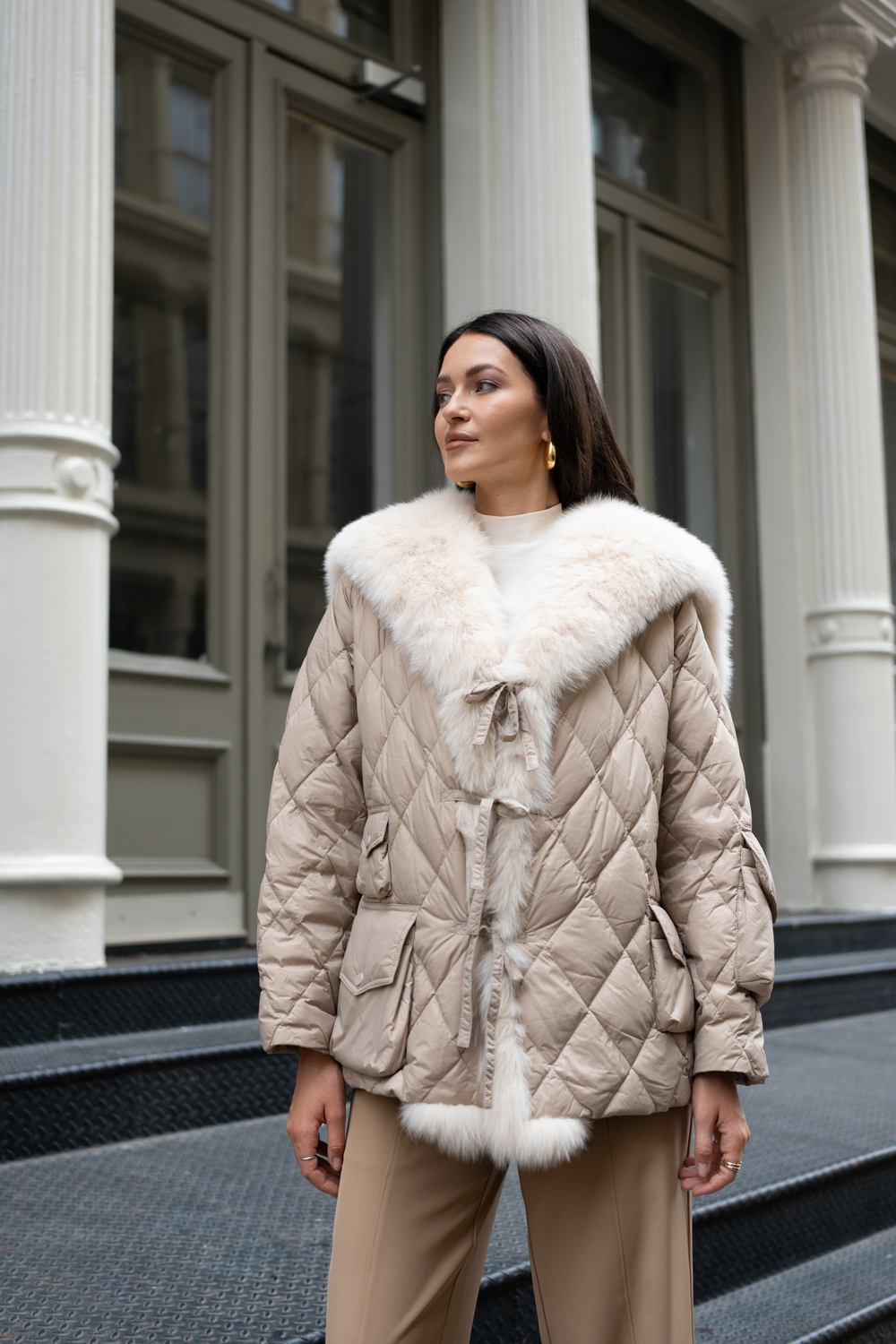 Stay cosy and comfortable in this short-down jacket filled with high-quality down and duck feathers, providing unparalleled warmth and breathability. The design includes bow tie embellishments for a secure and stylish closure, as well as pockets with flaps. This down jacket features a fox fur sailor collar, making it versatile and timeless.
